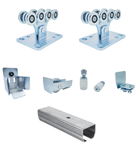 Sestava pro samonosné posuvné brány do 350kg. Vše co potřebujete pro zhotovení kvalitní samonosné posuvné brány bez pohonu.