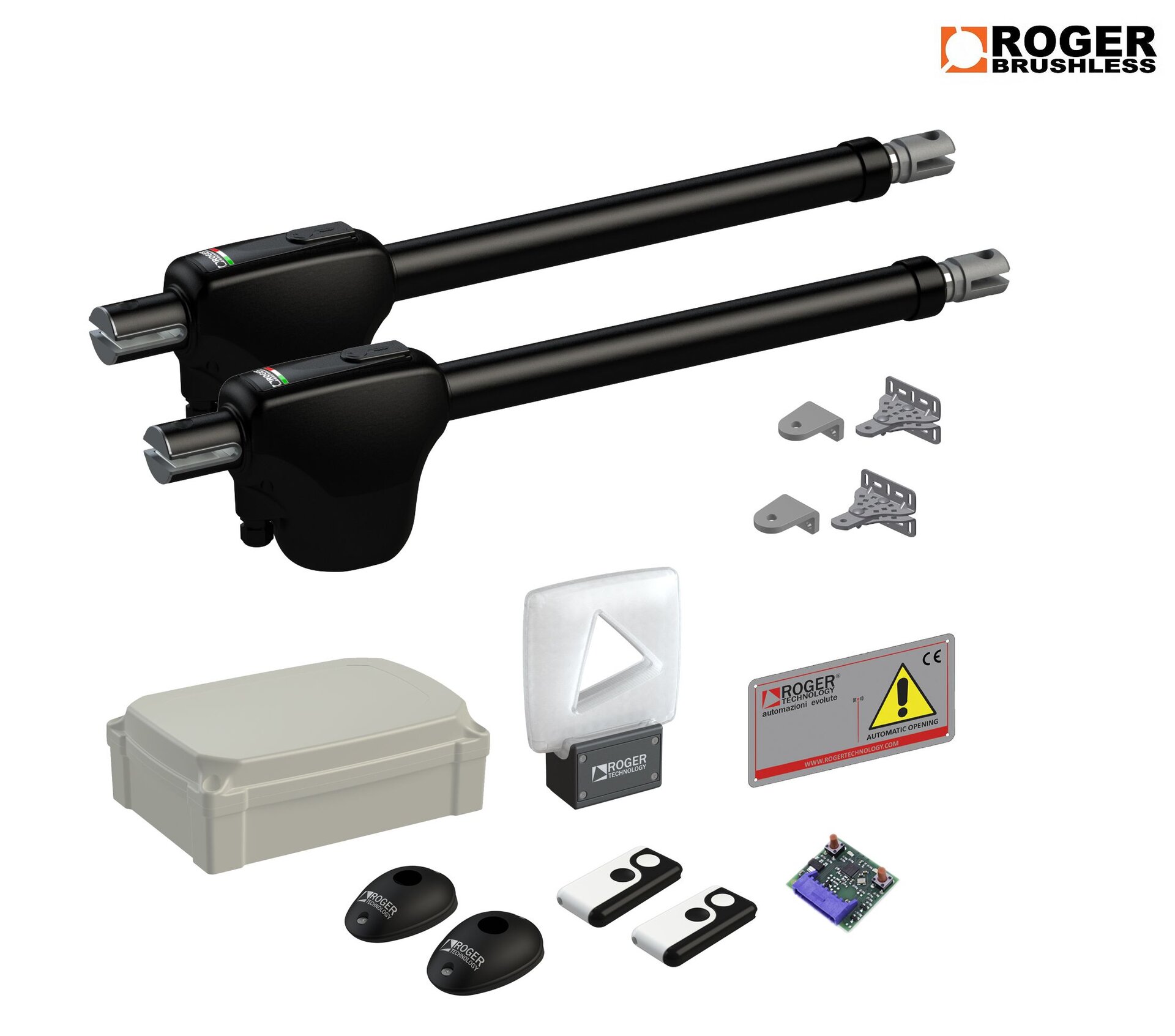 Originál sada pohonu s příslušenstvím od ROGER TECHNOLOGY!! Sada pohonu pro super intenzivní provoz. Kompletní sada pohonu pro křídlovou bránu. Určeno až pro velmi intenzivní provoz. Pohony brány lze použít jak pro otevírání dovnitř, tak pro otevírání směrem ven.
