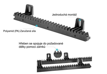 Ozubený nylonový hřeben pro pohony bran s ocelovým jádrem a šesti podpěrnými úchytkami směrovanými dolů. Vyznačuje se tichým chodem, proto je ideální volbou pro privátní brány.