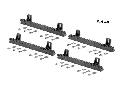 Sada 4m Ozubeného nylonového hřebene pro pohony posuvných bran s ocelovým jádrem a šesti podpěrnými úchytkami směrovanými dolů. Vyznačuje se tichým chodem, proto je ideální volbou pro privátní brány.